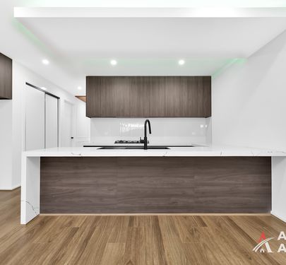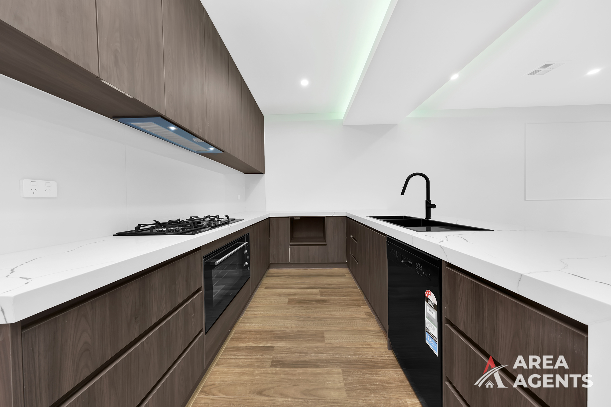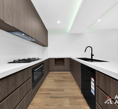 Designer Kitchen That Blends Style & Functionality - The heart of the home showcases a stunning designer kitchen featuring rich timber-look cabinetry, premium stone waterfall benchtops, and a spacious U-shaped layout ideal for everyday cooking and entertaining. Equipped with 900mm stainless-steel appliances, sleek black tapware, dual sink, and an abundance of storage including overhead cupboards and deep drawers, this kitchen delivers both elegance and practicality. The clean lines, LED feature lighting, and glossy splashback enhance the contemporary feel, while the expansive breakfast bench provides the perfect space for meals, gatherings, or family conversations.