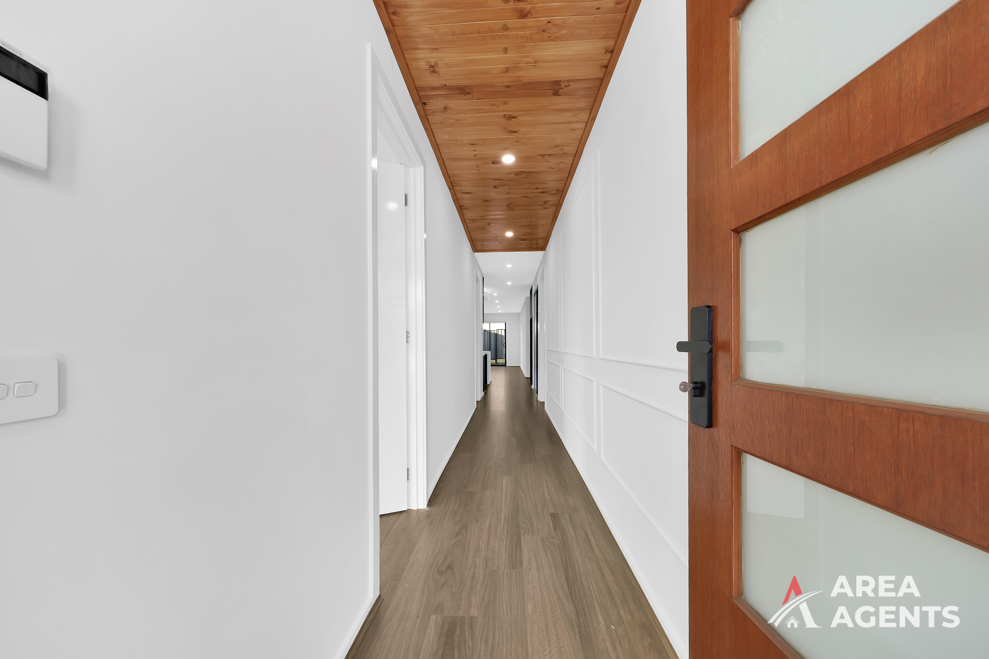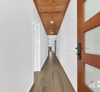 Stunning Entry & Street Appeal - From the moment you arrive, this home impresses with its contemporary façade, exposed aggregate driveway, and modern front door design that welcomes you in with style. Step inside to a beautifully crafted hallway featuring a timber-lined ceiling, designer wall panelling, and wide flooring that sets the tone for the premium finishes showcased throughout the home. The long, light-filled corridor effortlessly leads you into the heart of the residence, creating an immediate sense of space, warmth, and modern elegance.