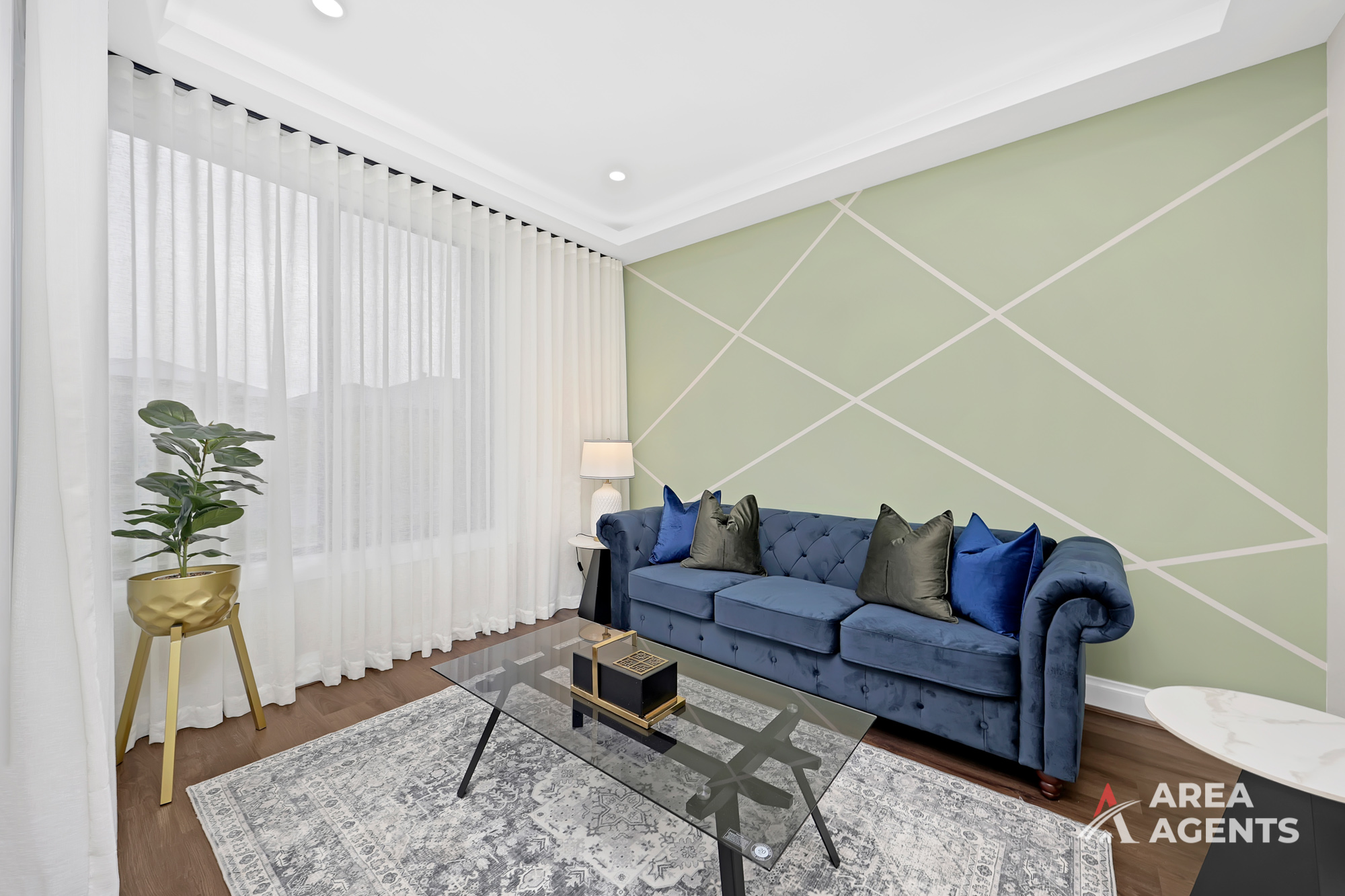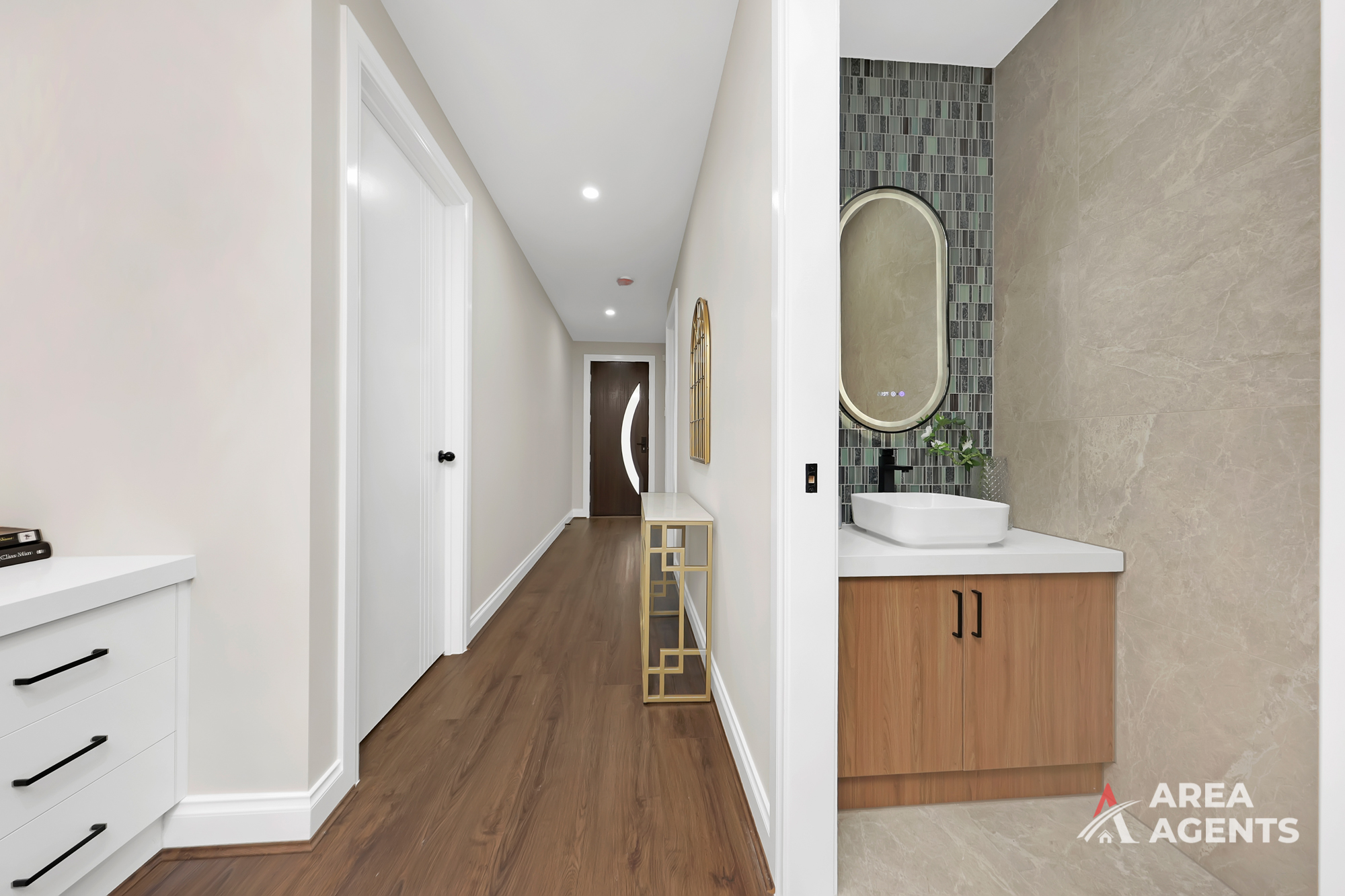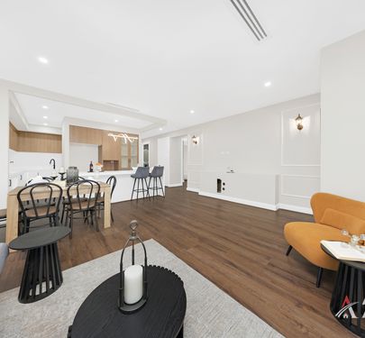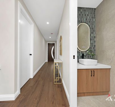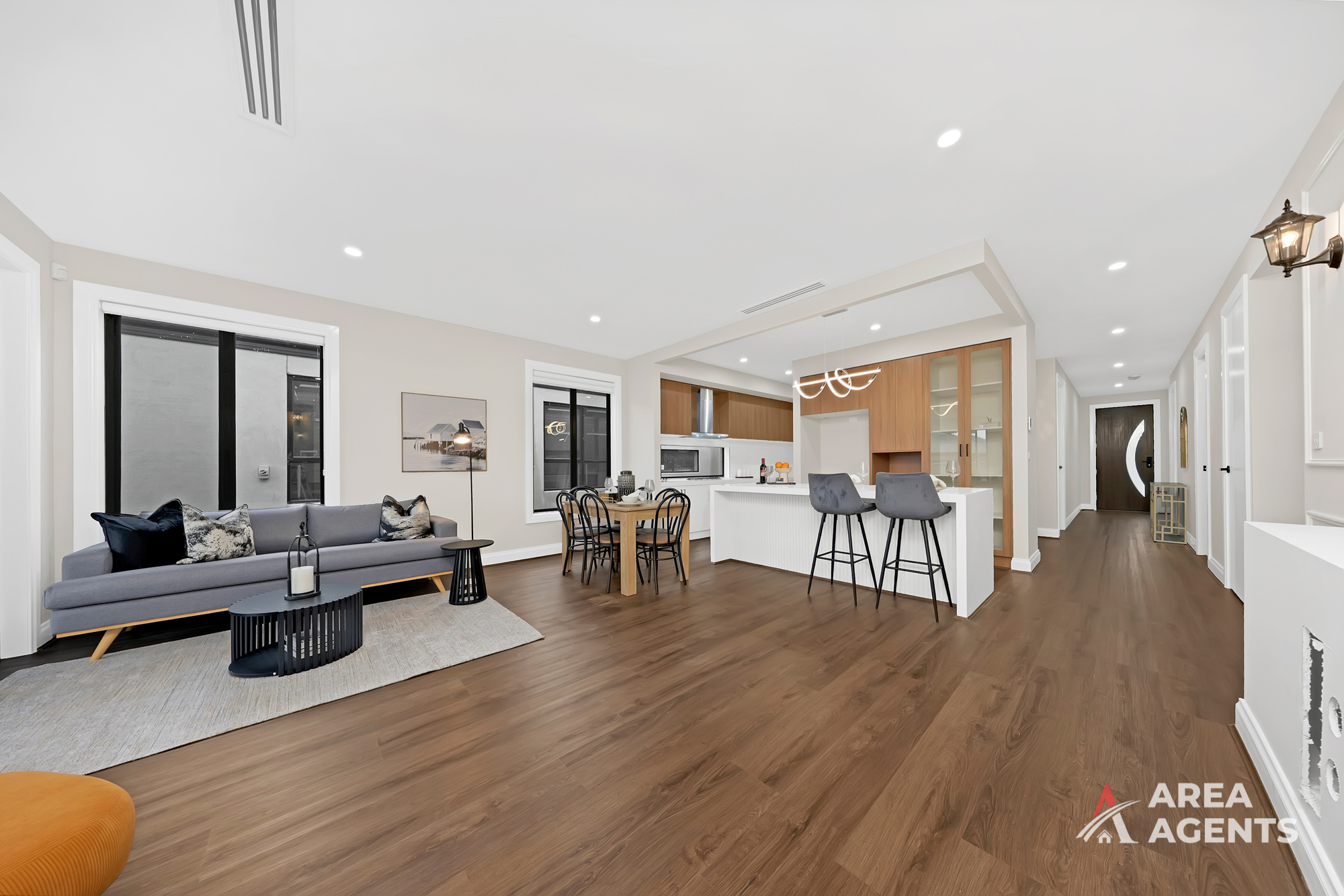 Entry & Designer Hallway - Step through the impressive wide front door into a breathtaking hallway that stretches the full length of the home. Highlighted by hybrid timber flooring, decorative wall paneling, high ceilings, and a wide, light-filled corridor this entry creates an immediate “wow factor.” The long gallery-style hallway leads seamlessly into the main living area, showcasing the home’s generous proportions and luxurious craftsmanship.