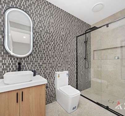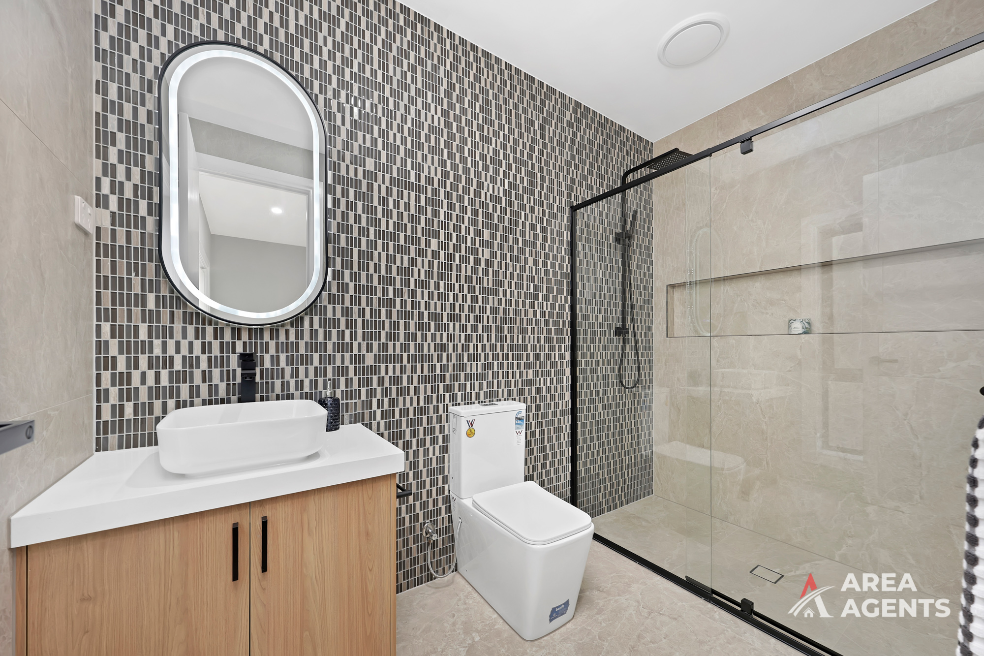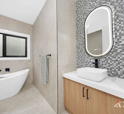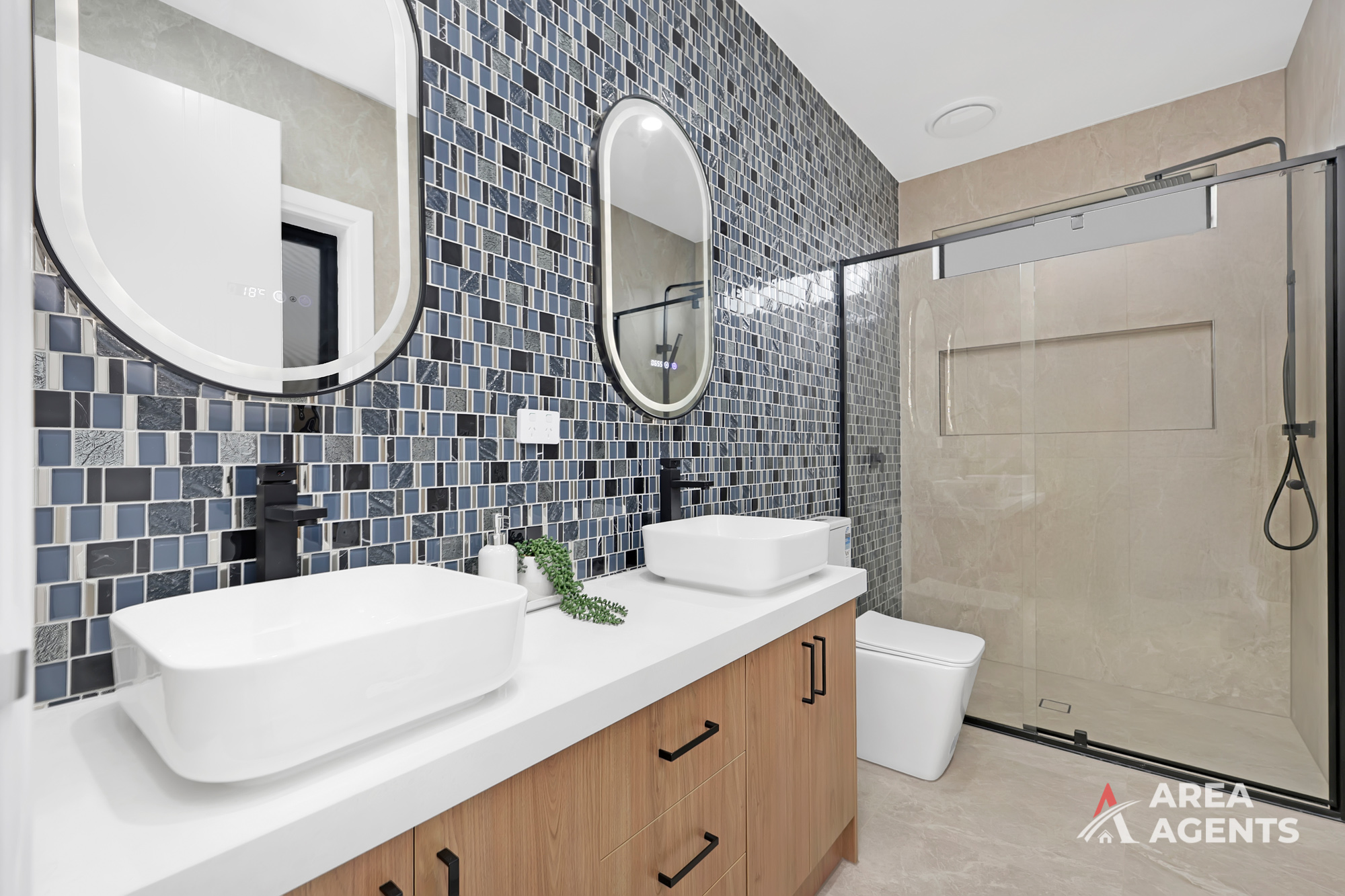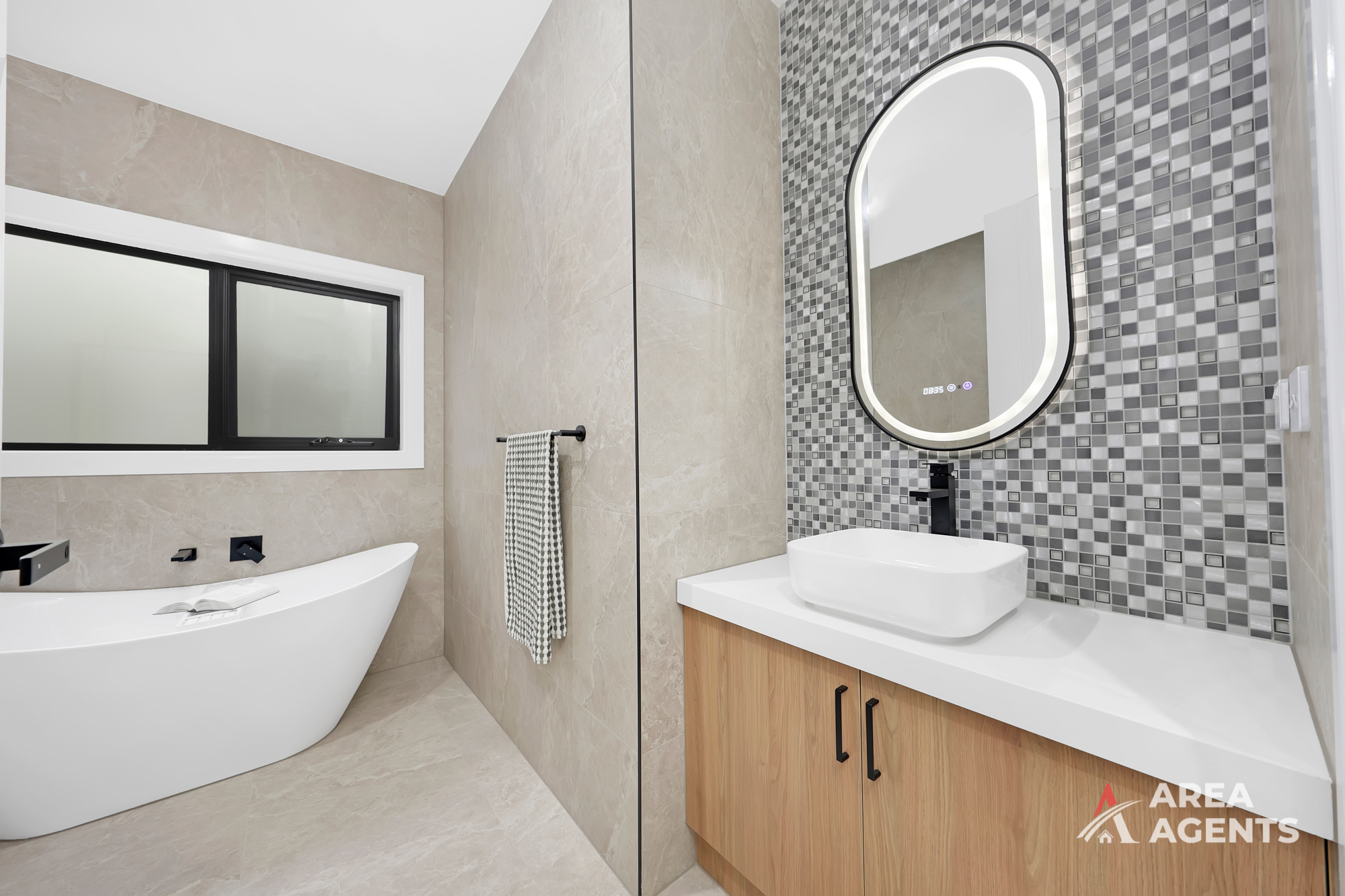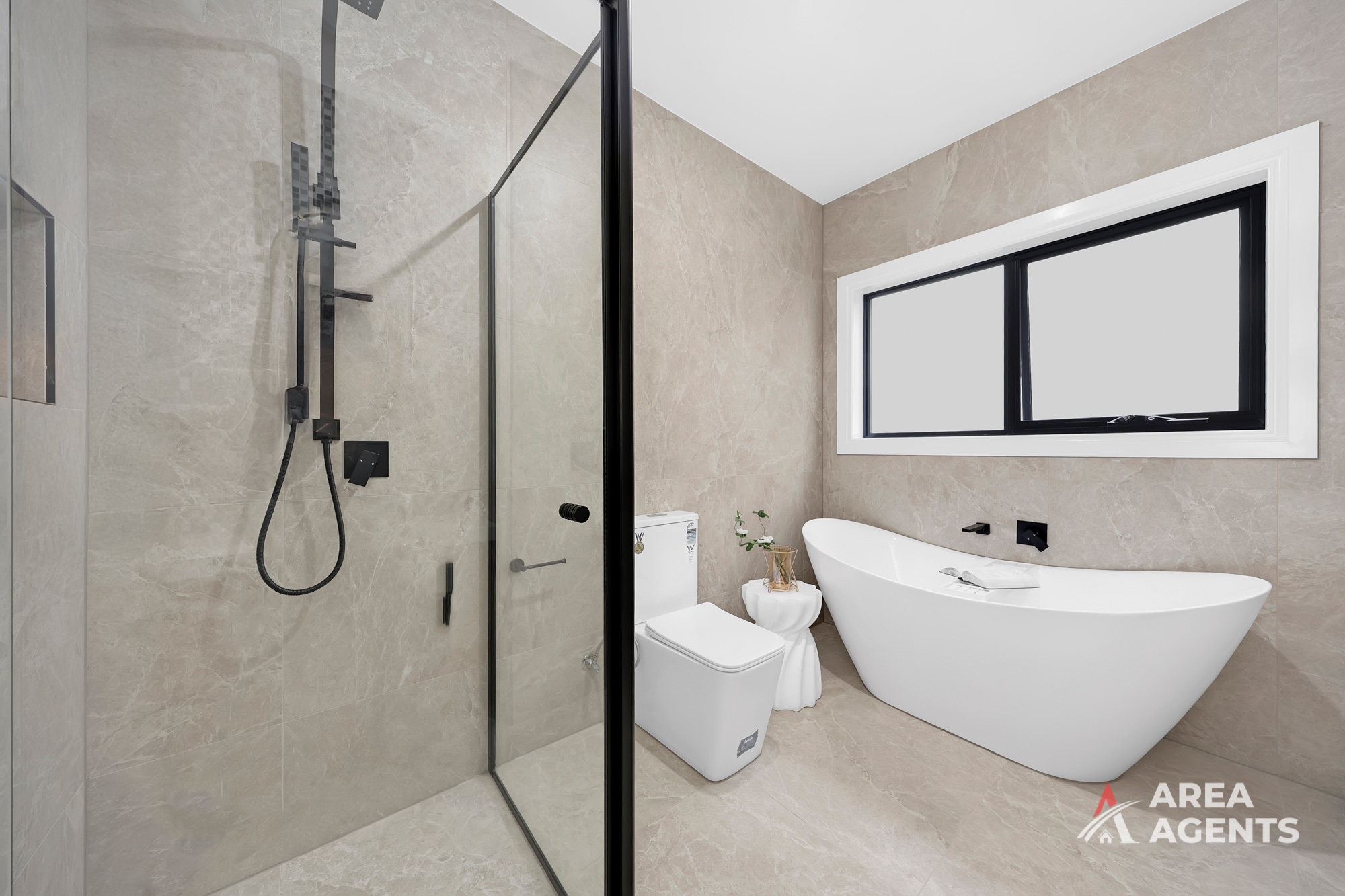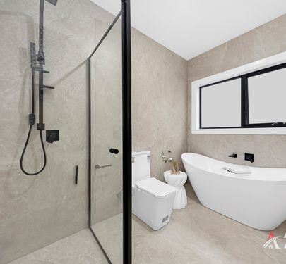 Premium Bedroom Accommodation for the Whole Family - This home offers two spacious master bedrooms, featuring generous walk-in robes and Built in robe, high ceilings, sheer curtains with roller blinds, and beautifully appointed modern ensuites complete with 60mm stone benchtops, floor-to-ceiling tiling, premium black fixtures, rain shower heads, double vanities, mosaic-tiled splash backs, and LED backlit mirrors for a refined hotel-style finish. The remaining two bedrooms include mirrored built-in robes with glass sliding doors and are serviced by a luxurious central bathroom showcasing a freestanding bathtub, oversized shower with rain head, full-height tiling, a sleek vanity with stone benchtop, and LED mirror delivering comfort and elegance for the whole family.