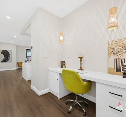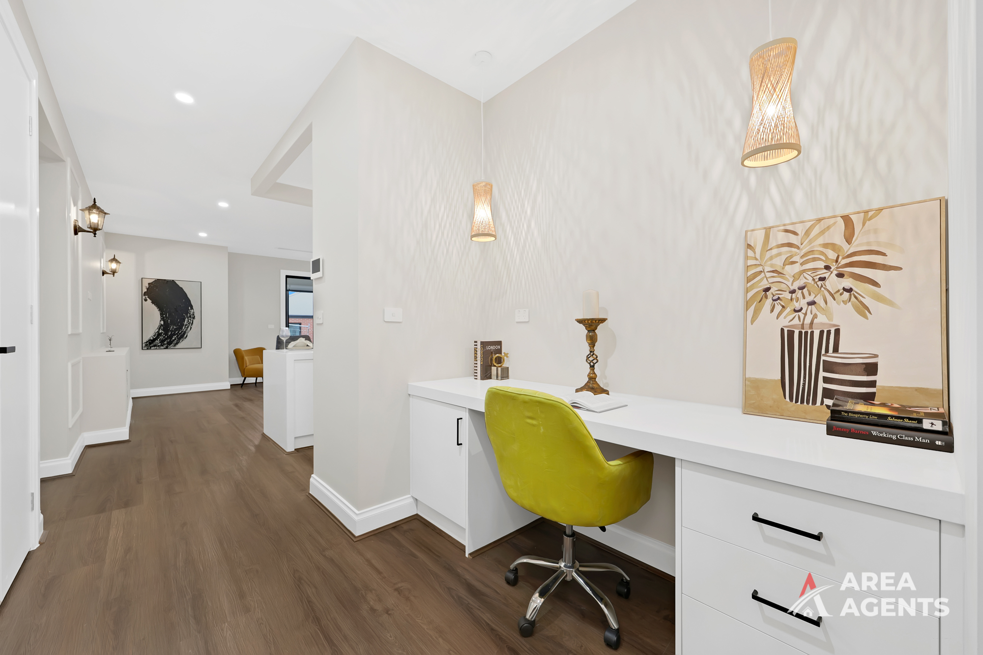 Study Nook- Thoughtfully positioned along the main corridor, this stylish study nook offers the perfect dedicated workspace for those working or studying from home. Featuring a long 60mm stone benchtop, ample storage drawers and cabinetry, and modern pendant lighting that casts a warm ambient glow, this beautifully designed space is both practical and visually impressive. Whether used for remote work, homework, or day-to-day organisation, the study nook provides a quiet, functional area while seamlessly complementing the home’s contemporary interior