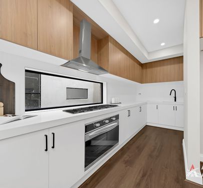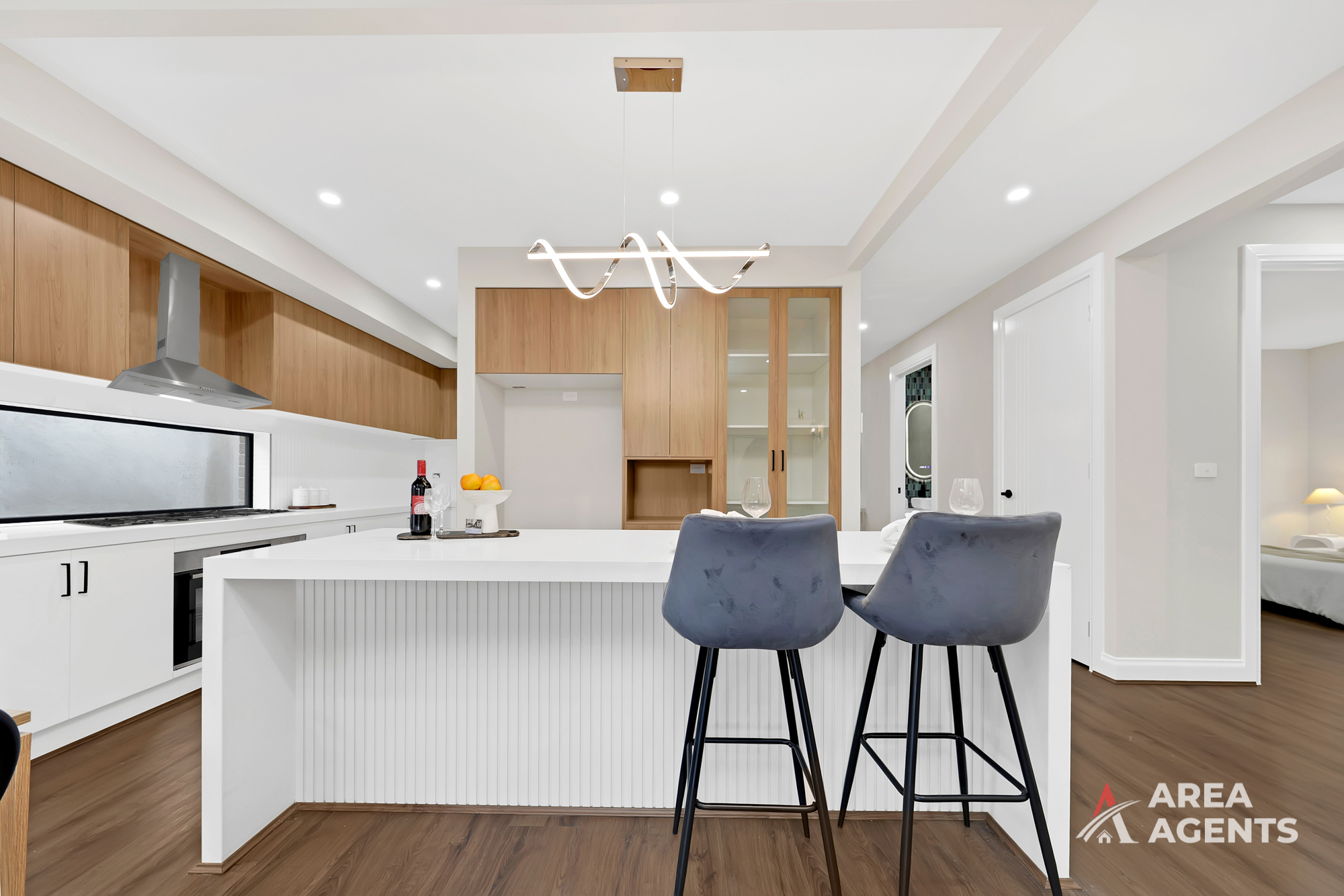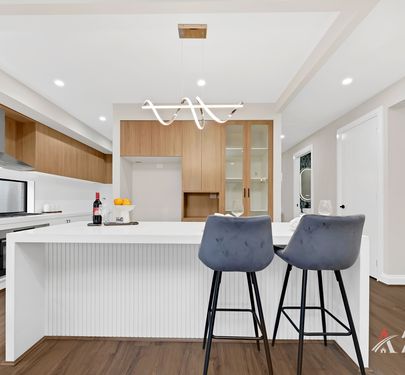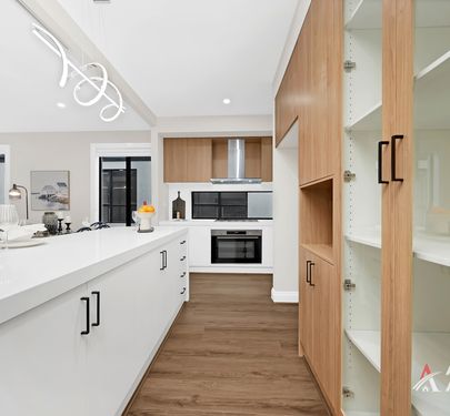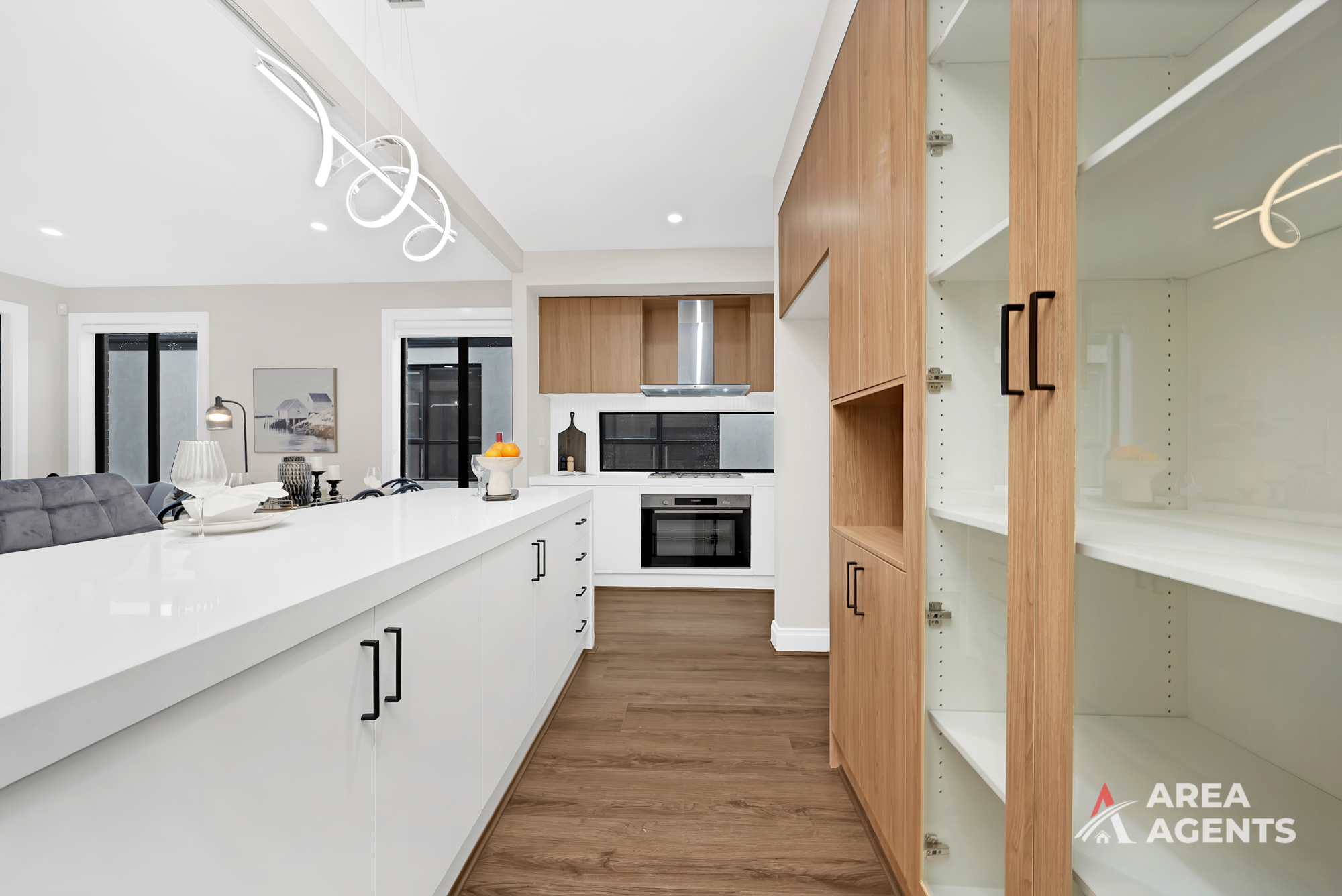 Designer Gourmet Kitchen with Butler’s Pantry - This beautifully designed gourmet kitchen showcases premium 60mm stone benchtops, highlighted by a sleek large mirror-fronted cupboard that enhances the sense of space and adds a touch of luxury, a striking island bench with fluted cladding that creates an immediate statement in the heart of the home. Finished with a sleek bulkhead and a designer pendant light, the space is complemented by quality 900mm Cooktop, Oven, and Rangehood and an abundance of storage throughout. The fully fitted butler’s pantry offers additional preparation space, extra cabinetry, a second sink, and direct access from the garage providing unmatched convenience for unloading groceries and keeping the main kitchen pristine.