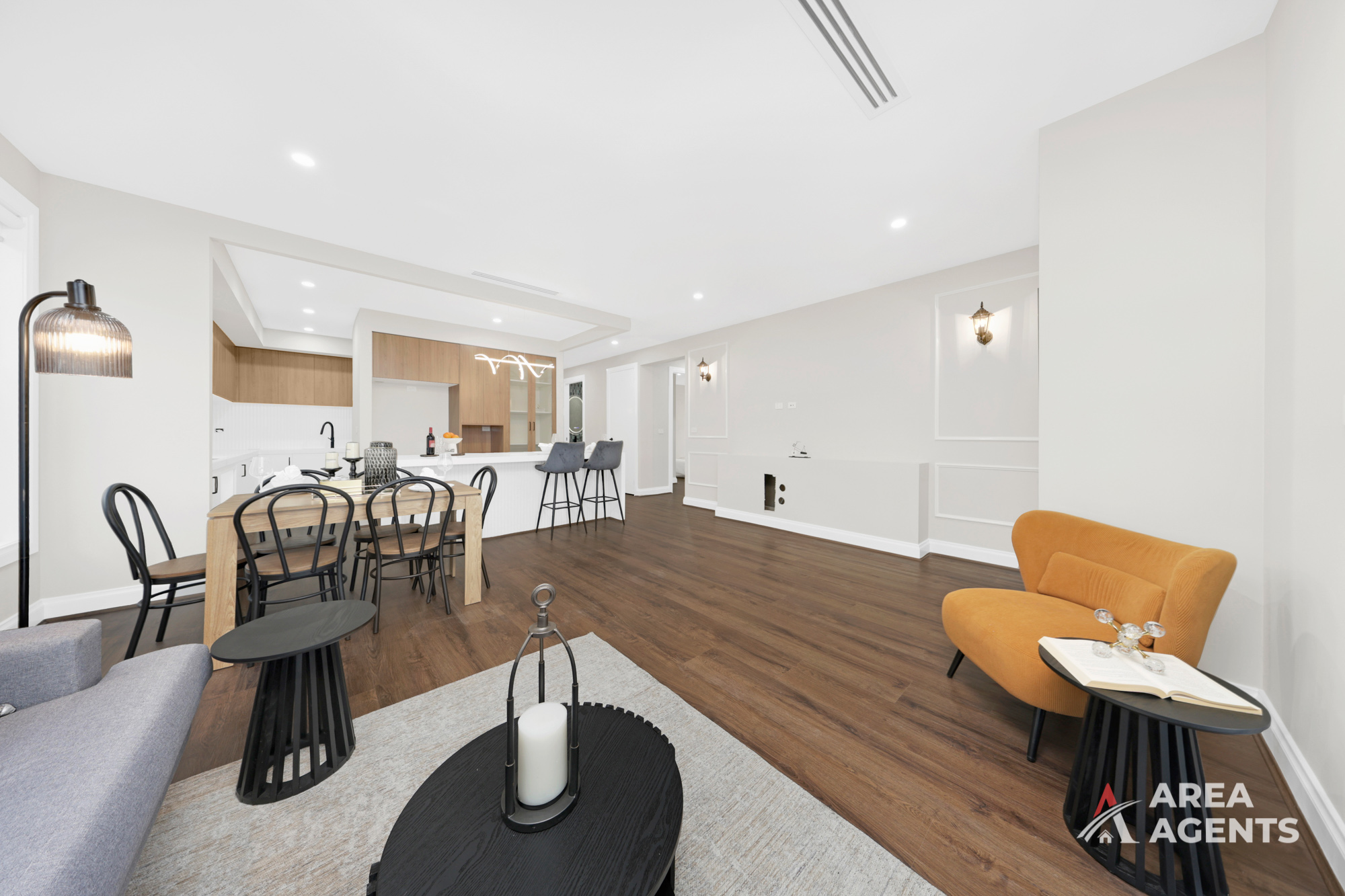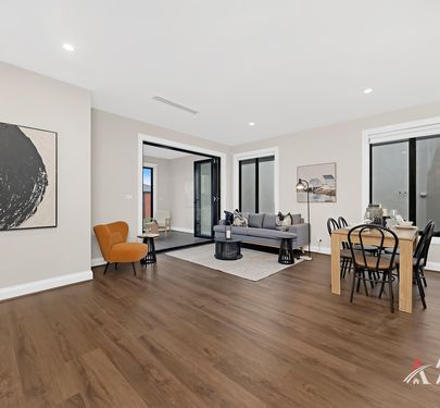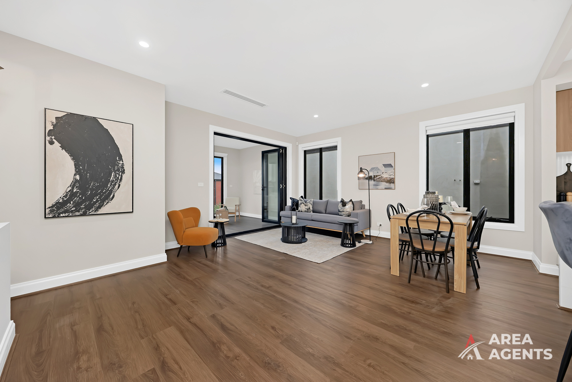 Luxury Family Living with Connected Sunroom Retreat -The expansive open-plan living and dining area is thoughtfully designed for both style and practicality, featuring a stunning full-height feature wall with inbuilt space for a fireplace, creating the perfect focal point for family living. The dining area flows seamlessly into the spacious lounge, all highlighted by wide hybrid flooring and abundant natural light. A set of large bi-fold doors opens directly into the connected sunroom, allowing the two areas to combine into one impressive indoor-outdoor entertaining space ideal for gatherings, meals, kids’ play or year-round relaxation.