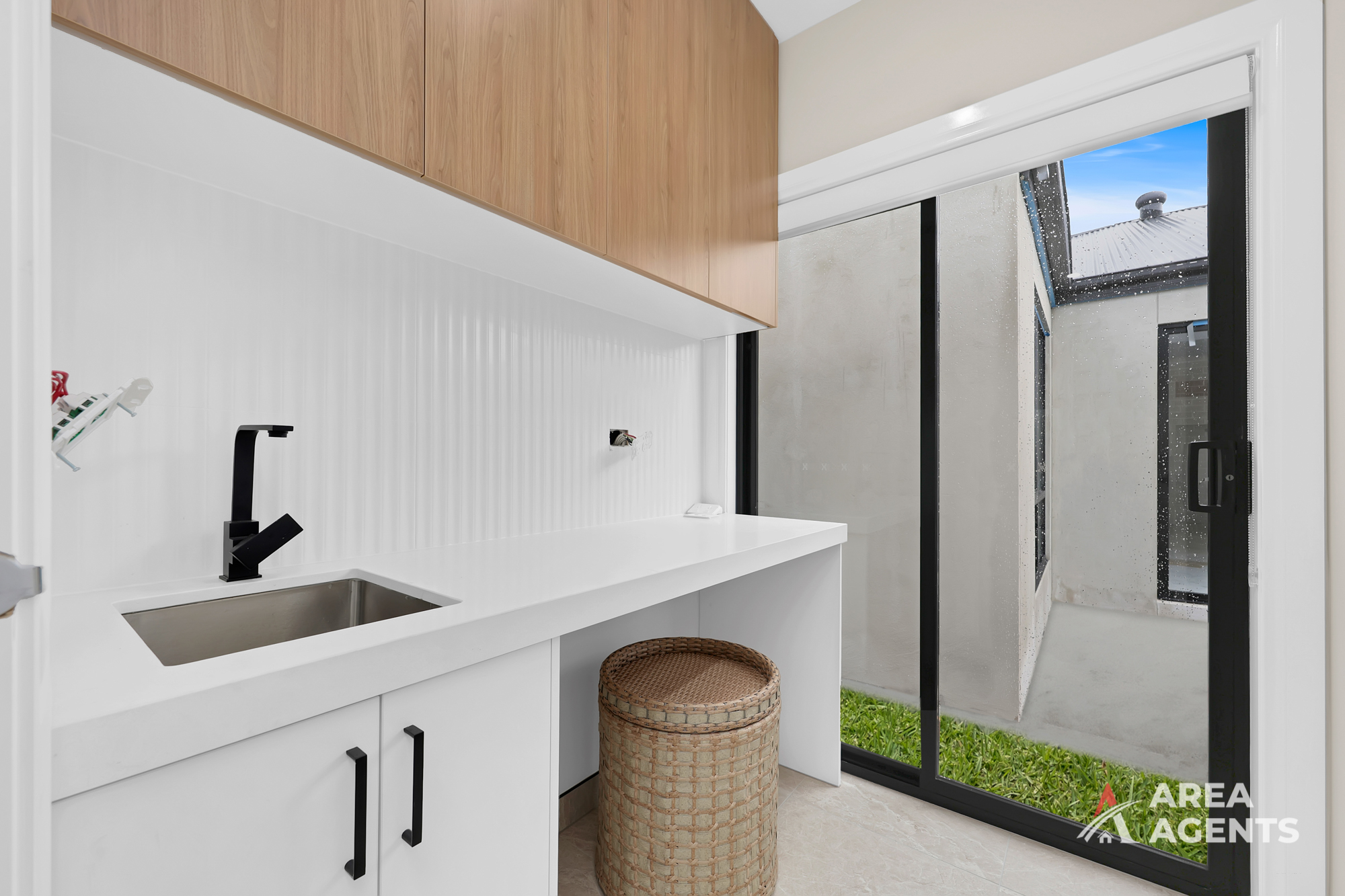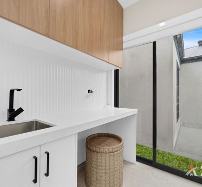 Practical & Elegant Laundry Zone - The stylish and functional laundry features a luxurious 60mm stone benchtop, extensive overhead and under-bench cabinetry for abundant storage, a sleek black mixer tap, and a full-length work surface perfect for sorting and folding. With direct outdoor access through the sliding door, this laundry is designed for convenience while maintaining the same high-end finishes showcased throughout the home.