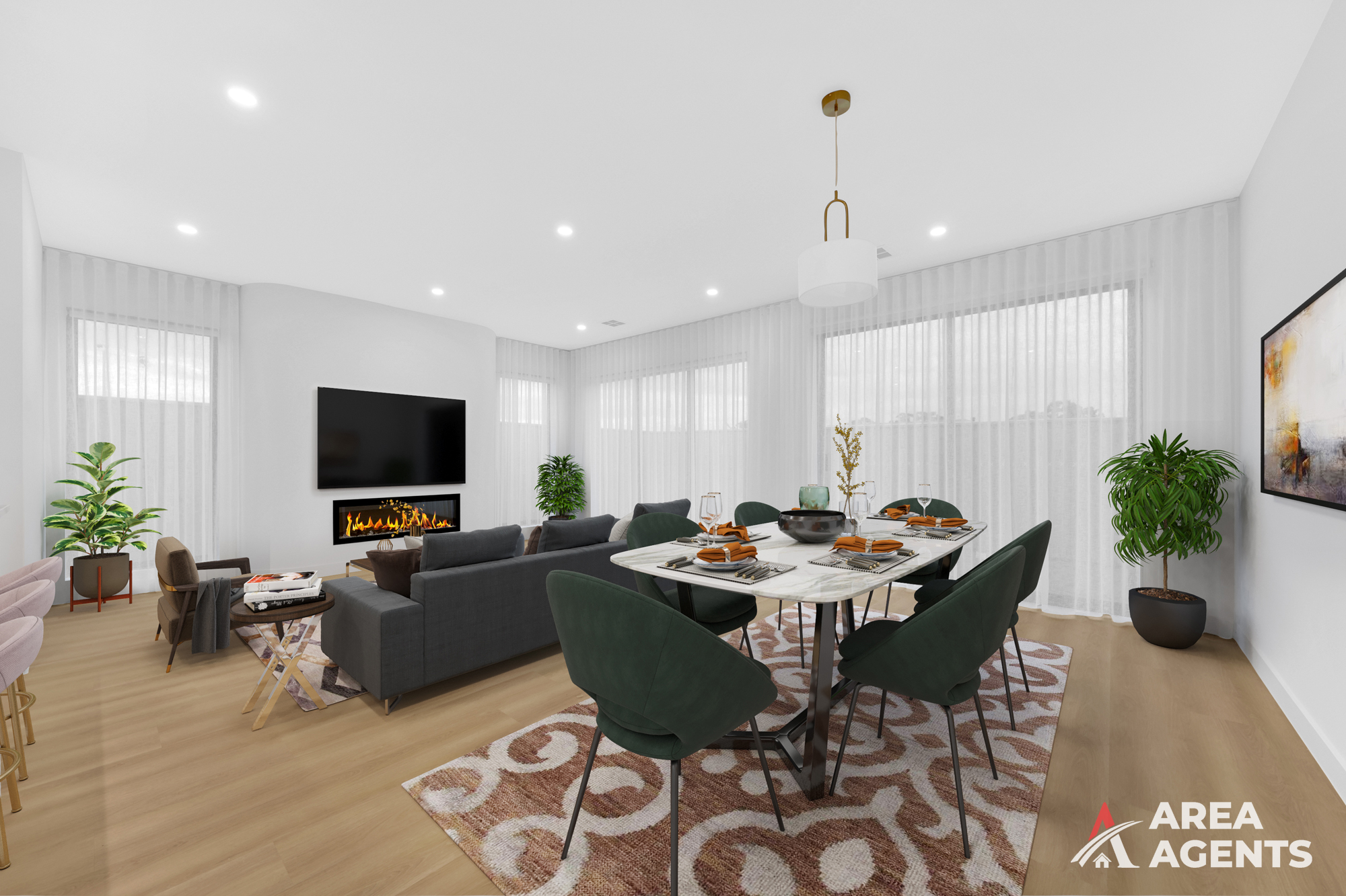 Next you step into a beautifully presented lounge that exudes warmth, simplicity, and modern elegance. Bathed in natural light through expansive windows dressed in soft sheer curtains, this inviting space creates a calm and relaxing atmosphere perfect for everyday living or entertaining guests.