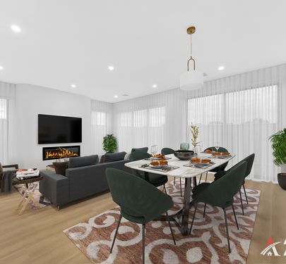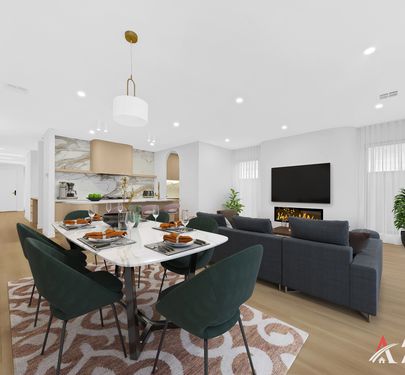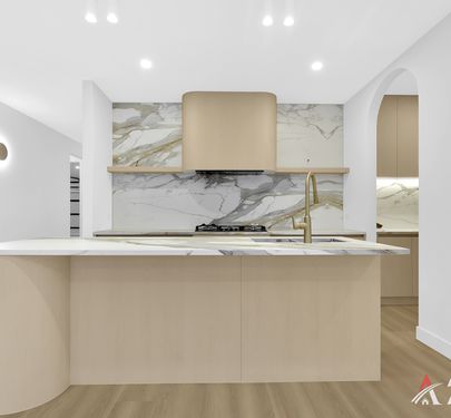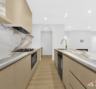 The heart of the home is a stunning open-plan kitchen, living, and dining area, featuring porcelain waterfall benchtops, a striking splashback, 900mm appliances, and elegant gold-accent finishes. The oversized island serves as a central hub, flowing seamlessly into light-filled living spaces enhanced by sheer curtains and a stylish electric fireplace. With timber-look flooring, high ceilings, and unique arched and curved design elements, this space delivers the perfect blend of modern sophistication and everyday comfort.