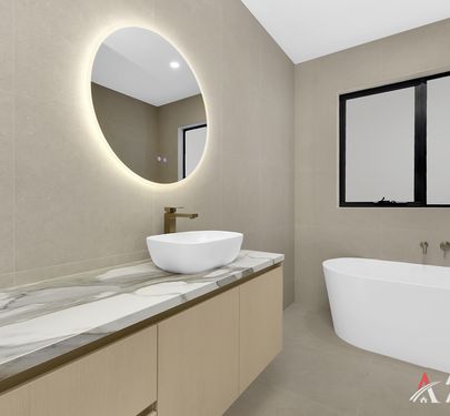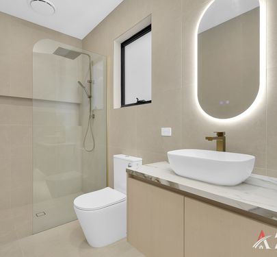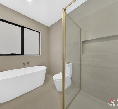 Beautifully finished with a modern, hotel-inspired feel, the common bathroom features an elegant freestanding bathtub alongside a walk-in shower with frameless glass and built-in niche. A sleek floating vanity with stone benchtop and vessel basin is complemented by a LED backlit mirror and premium gold-finish tapware, adding a touch of luxury. Complete with full-height tiling in soft neutral tones, a natural light window, and a low-maintenance, practical layout, this space perfectly balances style and everyday functionality.